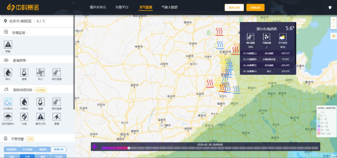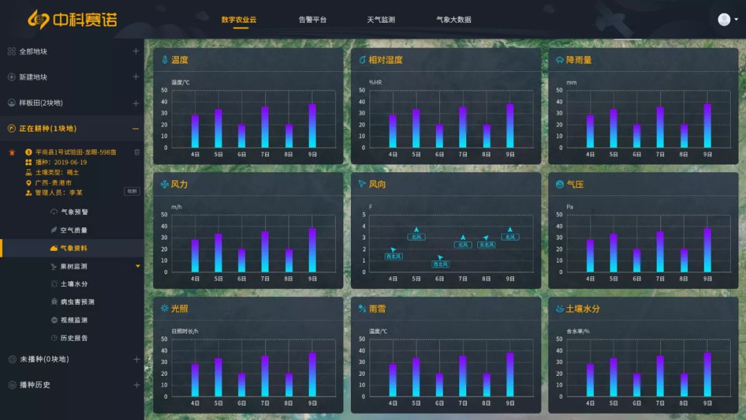 为适应农业生产精准化、智能化的发展趋势,中科赛诺围绕全国各省市不同农物种植和生产的实际需求,基于高并发私有云,融合国家气象局监测站、区域气象站数据、气象卫星等多维度资料同化技术,建立自主知识产权的天气气候数值模式,形成了完整的农业气象精细化智能服务平台,实现了全国小气候精准气象服务,对农业生产中可能出现的自然灾害、病虫害等进行预估,进行全天时的监测,同时通过深入的调查研究和分析处理,制定出高效的灾害应对措施,并对灾害情况发生的原因进行系统的分析与判断,指导农业生产,助其增产增收、防灾减灾。