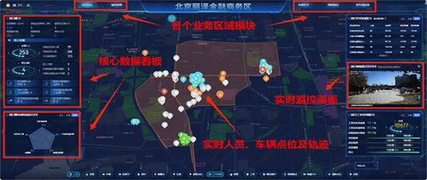 根据丽泽金融商务区现有城市物业服务需求,平台设立“城市体征、城市综管、市政环卫、园林绿化、停车场运营”五大界面,实时监控各场景运行状态,核心功能包括:
