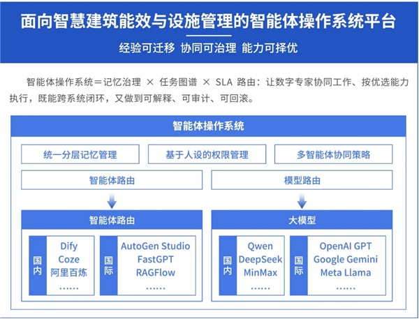 人工智能(AI)持续演进,应用范式从算法驱动转向任务驱动,智能体(Agent)成为主流形态:围绕“目标—感知—推理—行动—反馈”可完成单场景任务闭环。但在智慧建筑等复杂场景中,目标常同时涉及能效、舒适、安全、碳排、费率等多维约束,任务跨系统/跨角色/跨时空耦合,单体智能体难以稳定满足多目标权衡与全局一致性,需多智能体协同完成分工配合、冲突消解与全局治理。随着生态与开源繁荣,智能体平台与“数字专家”将百花齐放、来源多元、能力差异显著;若缺少统一的记忆治理、协同编排、能力选择与安全审计机制,系统易陷入碎片化与“不可控智能”。