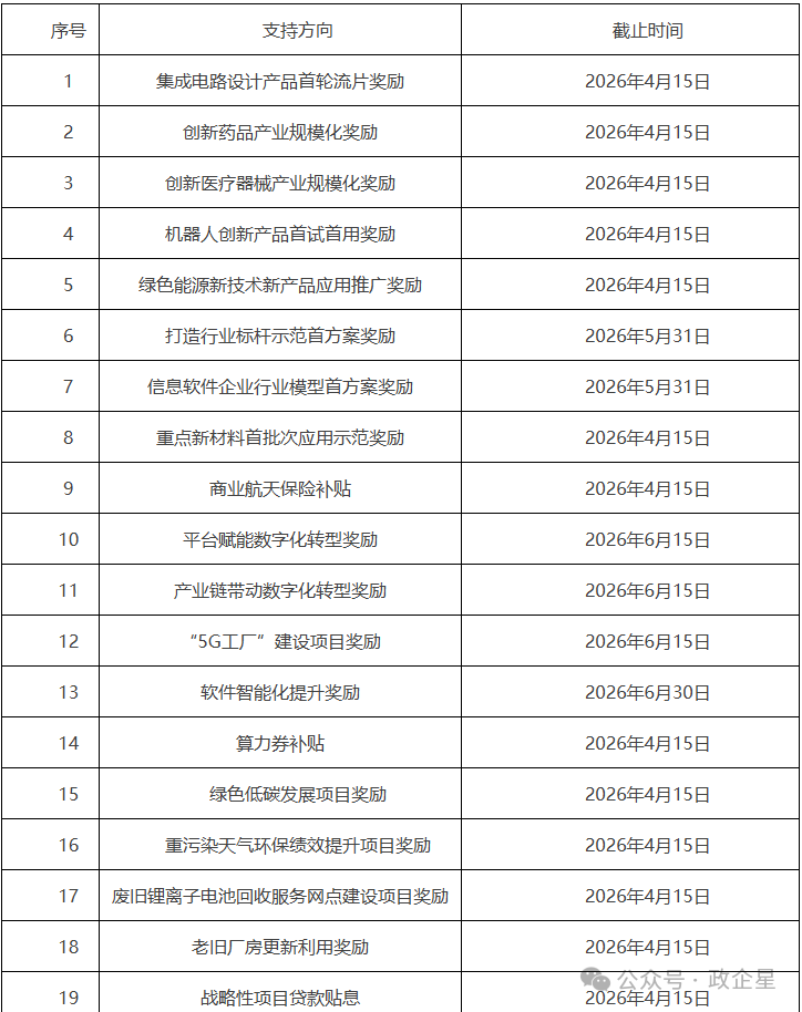 方向19 战略性项目贷款贴息。重点支持企业利用银行贷款开展产业示范引领带动作用强的战略性项目布局建设。对总投资50亿元(含)以上的智能网联新能源汽车整车制造领域战略性项目,以及总投资10亿元(含)以上的生物医药与健康产业、智能制造与高端装备、智能网联新能源汽车关键零部件、都市智能化数字化、先进材料与新能源产业及其他领域战略性项目和中试验证类项目,按项目建设期内企业已支付的利息分年度给予事后贴息,贴息率不超过人民银行公布的同期中长期贷款市场报价利率(LPR),贴息期限不超过3年,单个项目年度贴息金额不超过5000万元。(详见附件19)