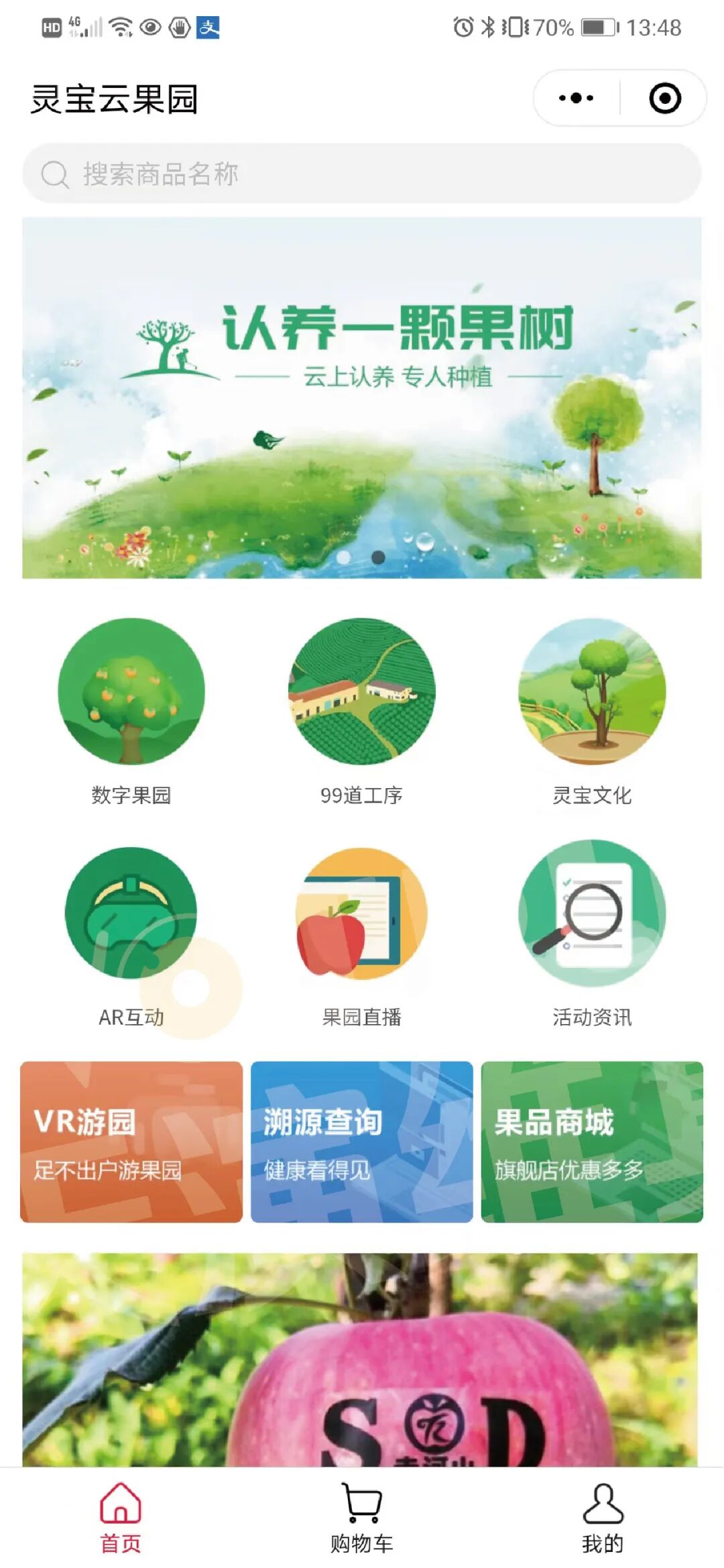 依托5G+VR、5G+AR等虚拟技术在线慢直播,让观看者产生身临其境的感觉,通过沉浸式体验提升灵宝苹果品牌粘性。另外,可在5G云上果园(果树认养) 认养一棵果树,通过苹果园区AI摄像机,真正实现“我在云上种苹果”。认养人可远程观看种植过程,果实成熟后可直接去园区采摘,或由果园快递到家。5G慢直播系统上线之后,得到累计近6万人次的访问量。云上果树认养开通后,累计获得400余人次的认养和在线下单。
