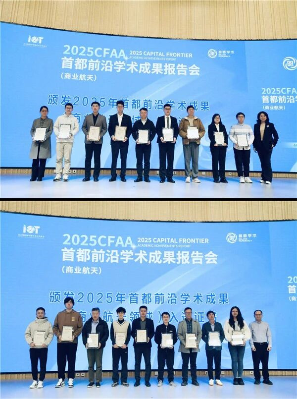 会议最后,举办了“2025年首都前沿学术成果(商业航天领域)入选证书颁发仪式”,对在商业航天学术研究与技术创新中取得突出成果的个人与团队进行表彰,以此激励更多科研工作者投身商业航天前沿领域研究,来自中国科学院、清华大学、北京理工大学、北京邮电大学、北京交通大学、北京科技大学、航天工程大学等学术代表,月明星、星测未来、极光星通、大航跃迁、零重宇航、宇航推进科技等企业代表共20项成果登台领证。